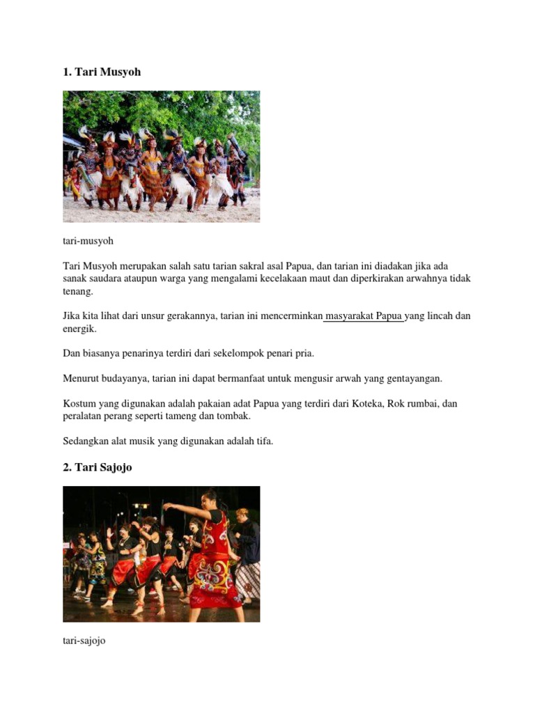 Tari Sajojo merupakan tarian tradisional yang berasal dari pulau paling timur Indonesia alias Papua. Gambyong semula merupakan nama seorang waranggana wanita terpilih atau wanita penghibur yang pandai membawakan tarian yang sangat indah dan lincah. Sebuah tarian keraton pada masalalu disertai suara gamelan dengan gerak tari yang lembut.